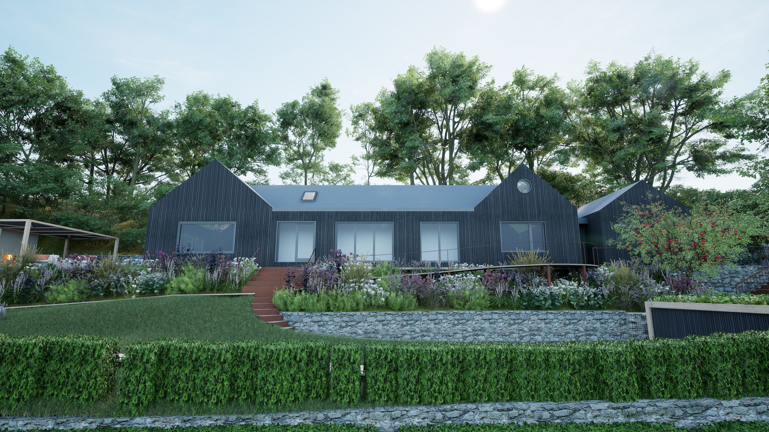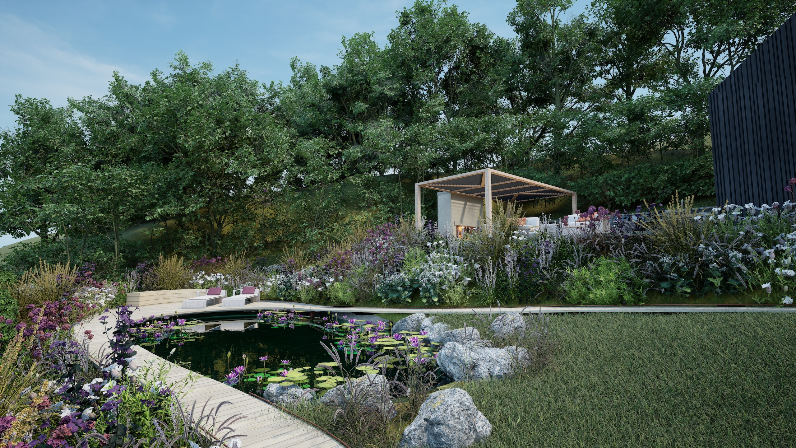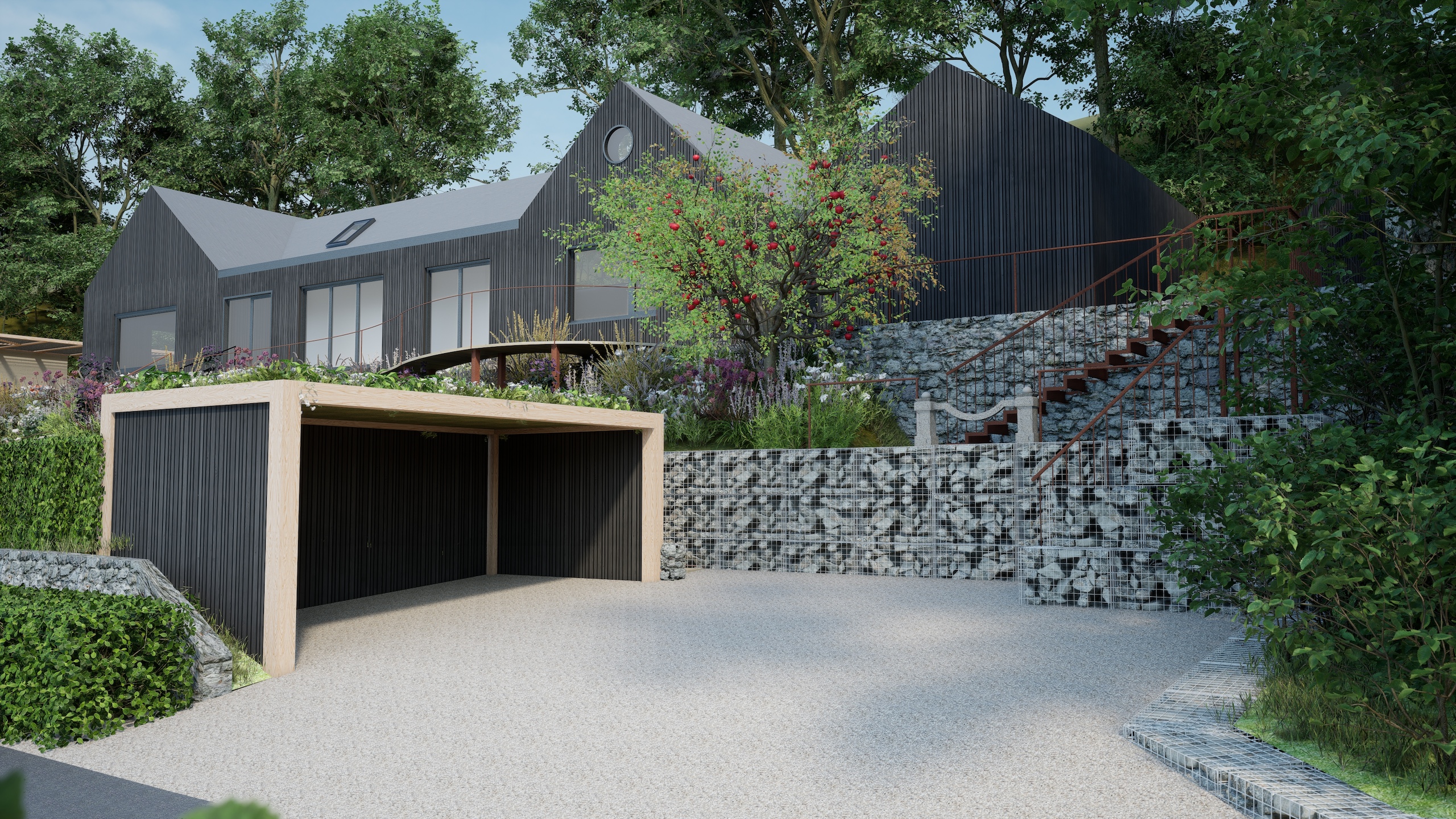 The striking architecture of the new dwelling is complemented by a flowing design using contemporary materials such as corten steel and composite decking with a large wildlife pool at the focal point of the garden.