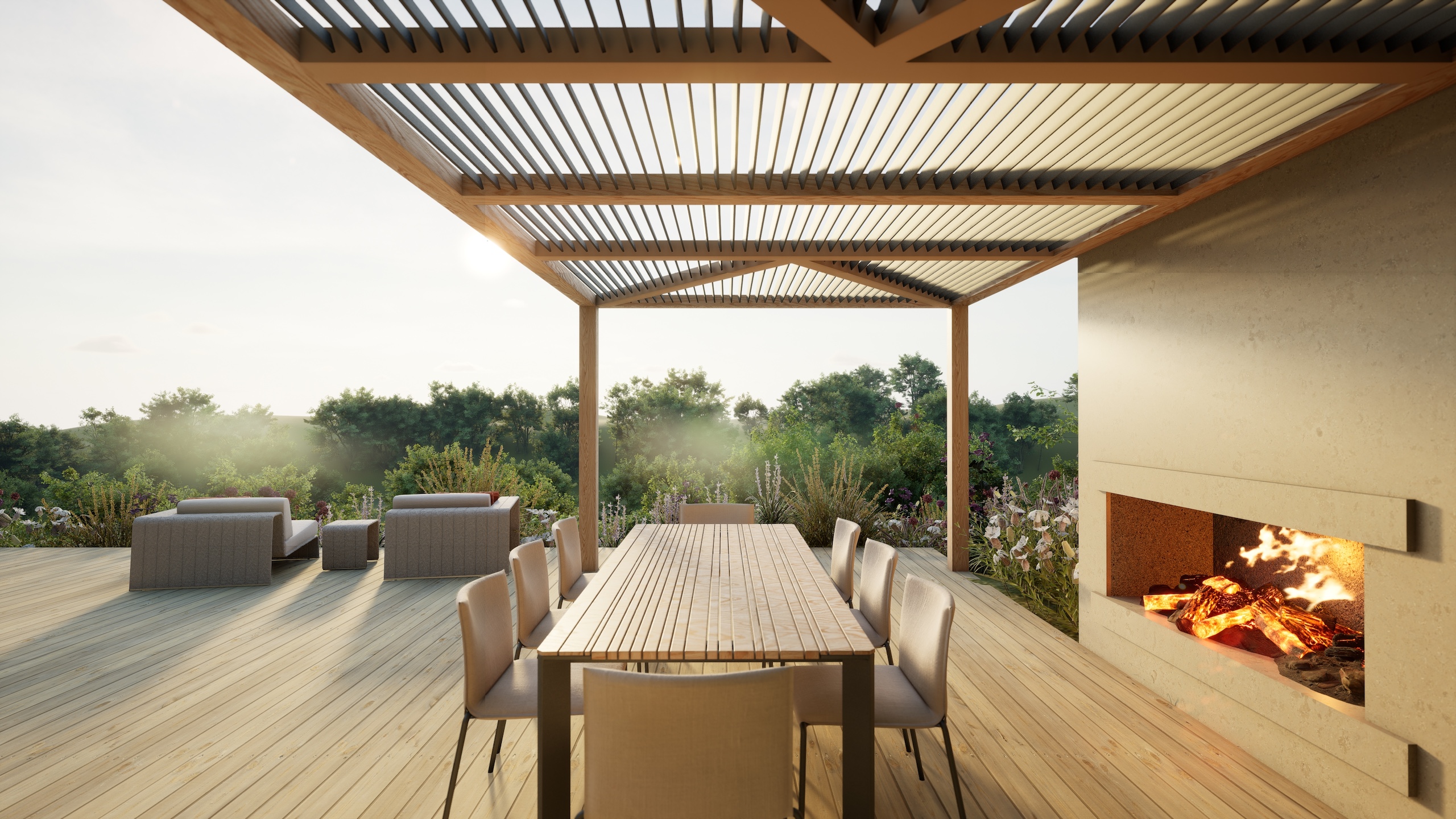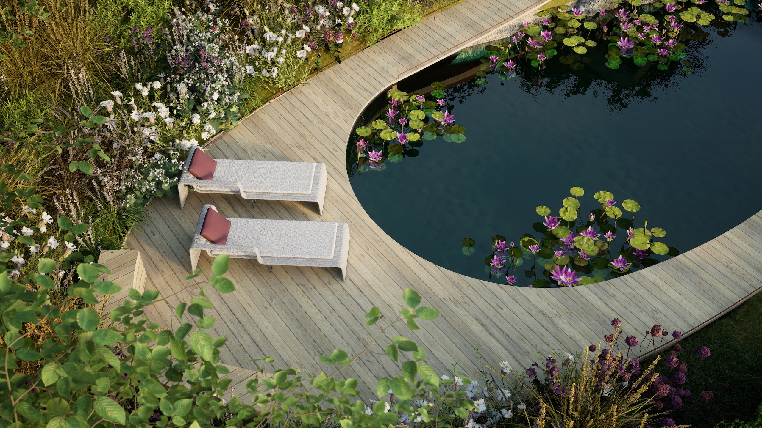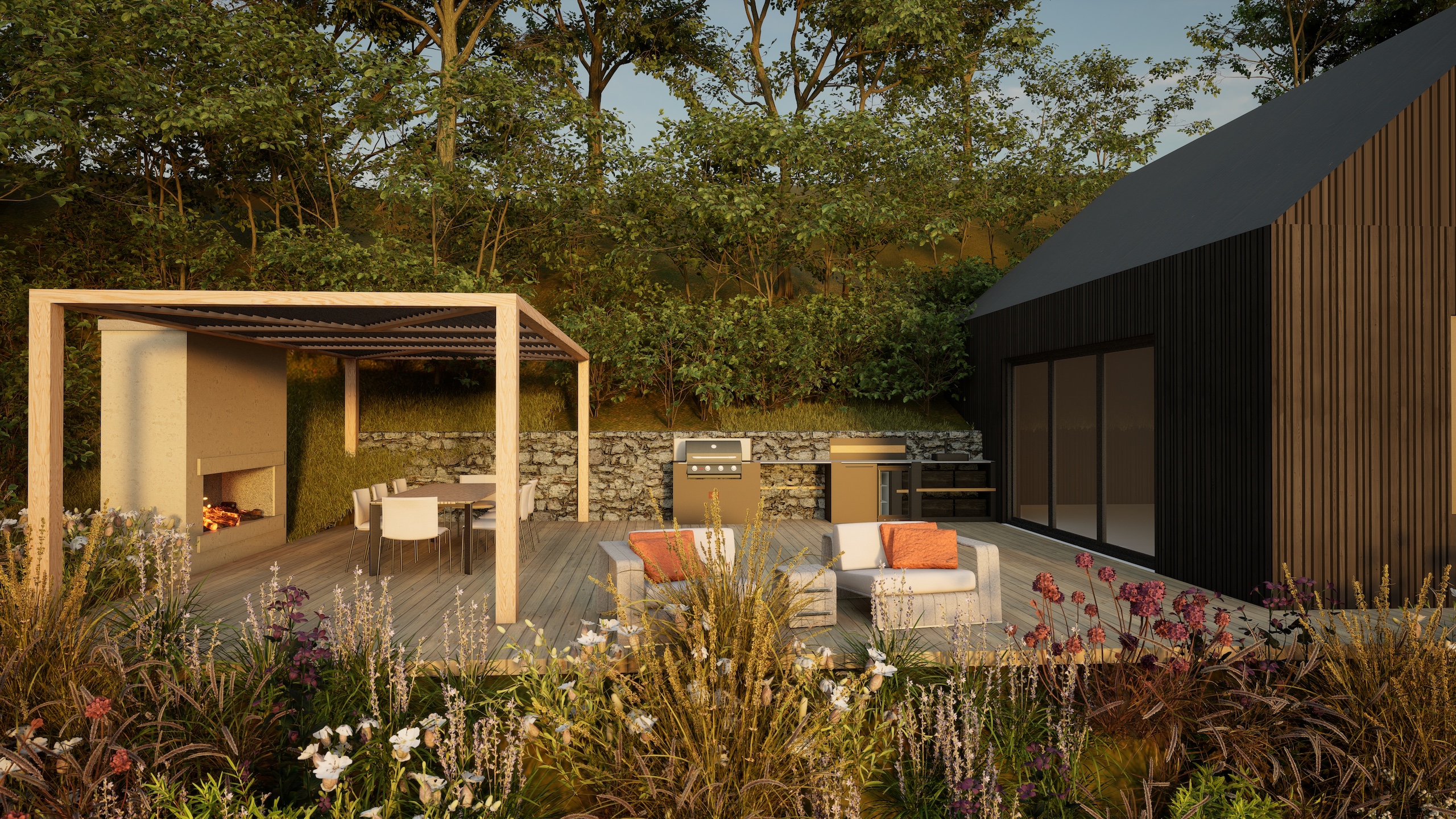 The striking architecture of the new dwelling is complemented by a flowing design using contemporary materials such as corten steel and composite decking with a large wildlife pool at the focal point of the garden.