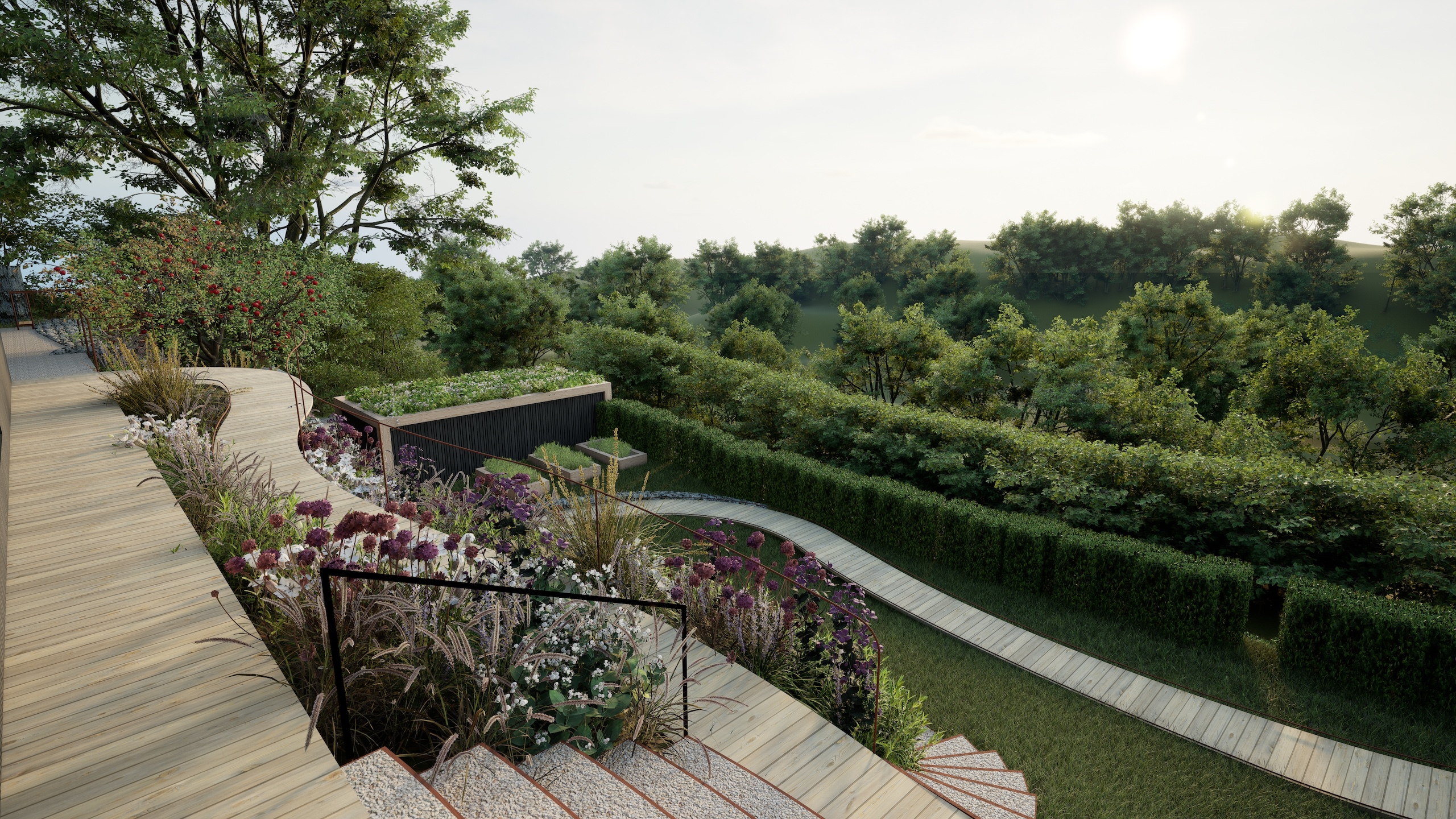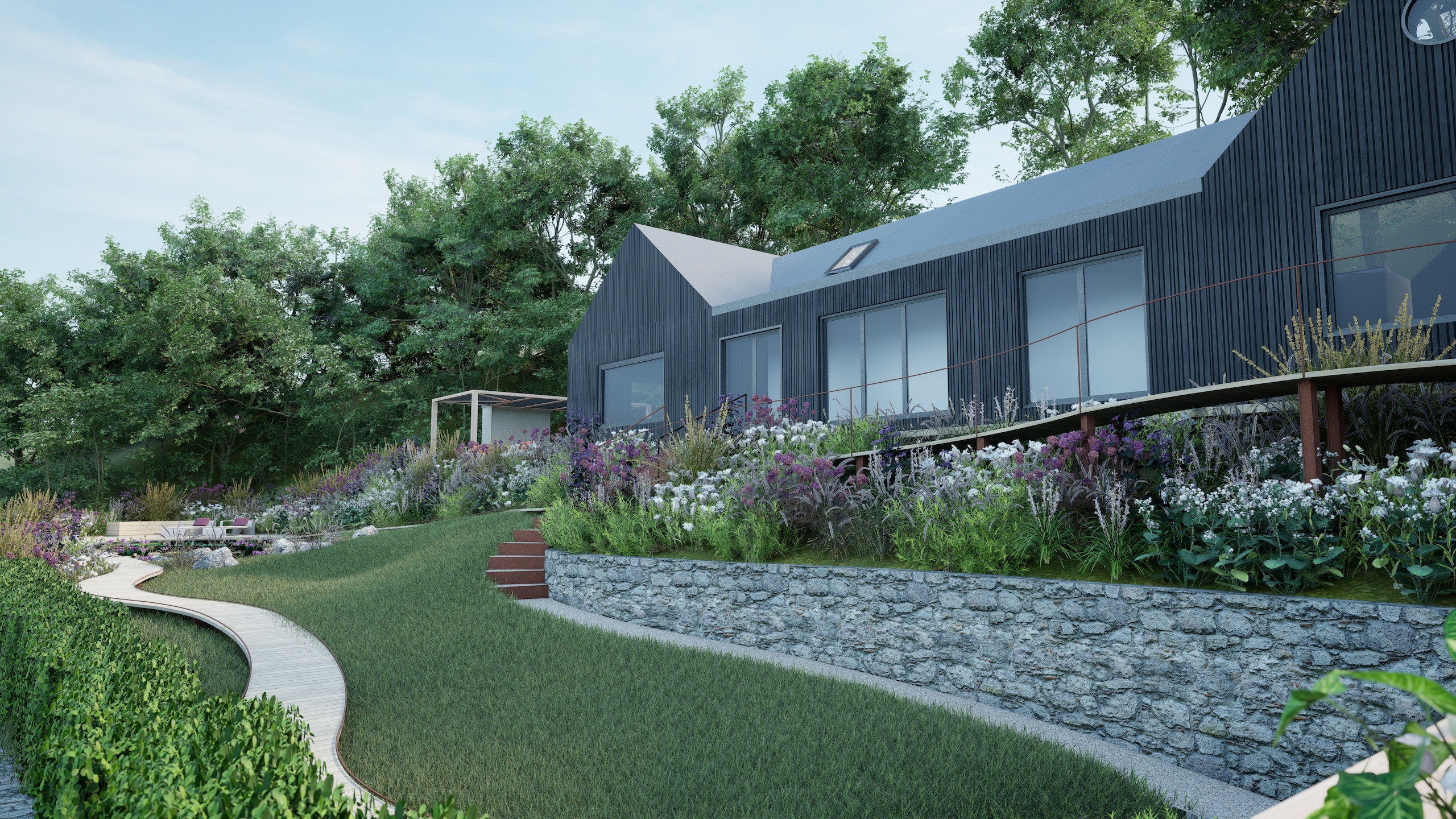 An ambitious project; the new landscape includes a level parking area with stone retaining walls to increase the safety and accessibility of the property. A ramped boardwalk meanders around the garden, providing step-free access to the property. The site is located within the Cornwall National Landscape and we were delighted to receive planning permission with no additional landscape conditions due to the strength of the proposal.